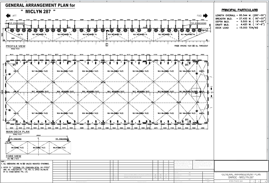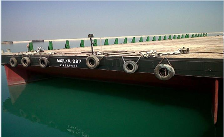 The barge is of all-welded steel construction with a flat-top deck, designed for heavy cargo transport and offshore operations.